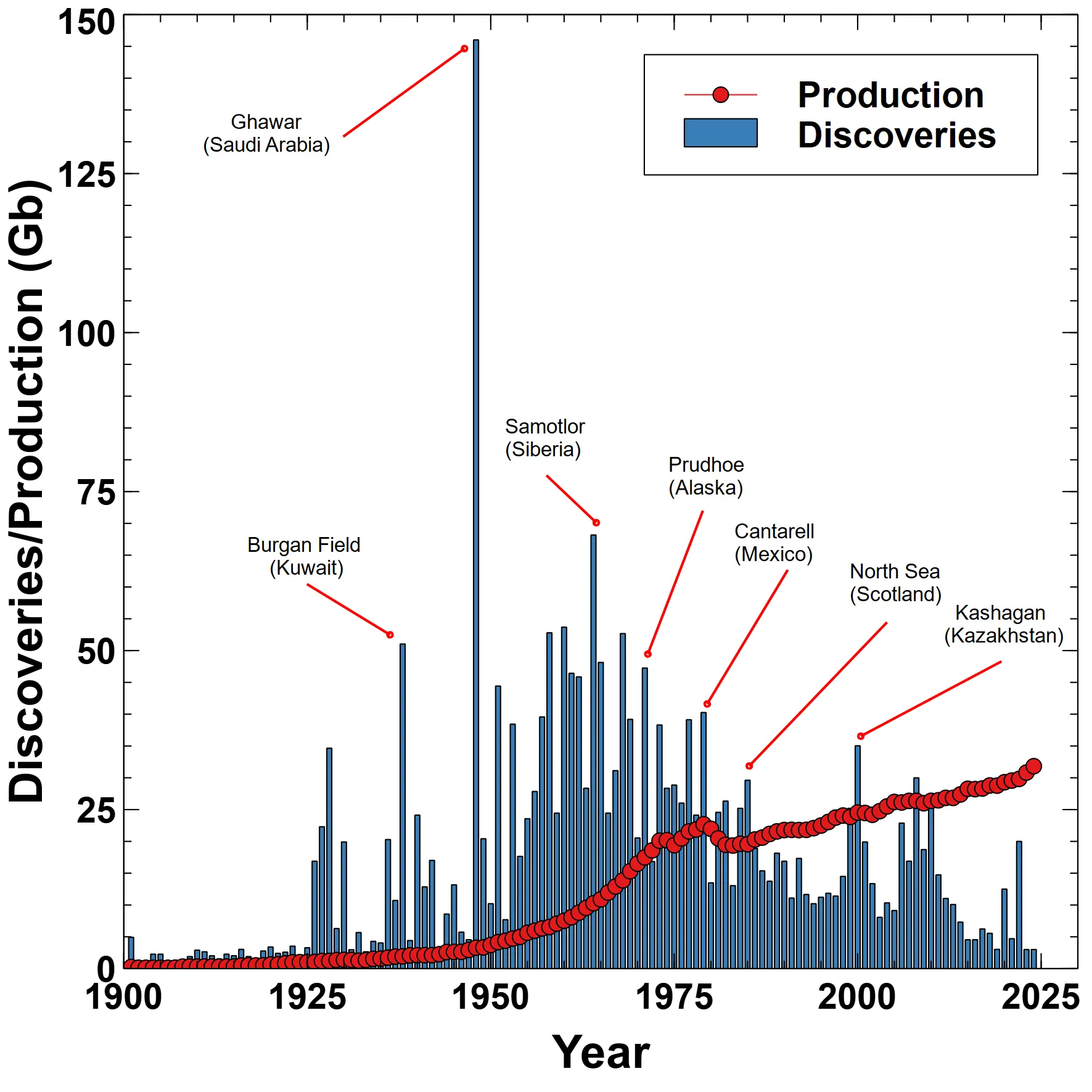 The largest field ever found is Ghawar in Saudi Arabia, discovered in 1948, but excepting that one giant field, petroleum field discoveries peaked in 1964 with the Samotlor field in Eastern Siberia. Production increased exponentially until the early 1970s, but has increased only linearly since, and with a few exceptions production has exceeded discoveries since the early 1980s. In 2024, oil production was 31.8 Gb while discoveries were only 3 Gb.