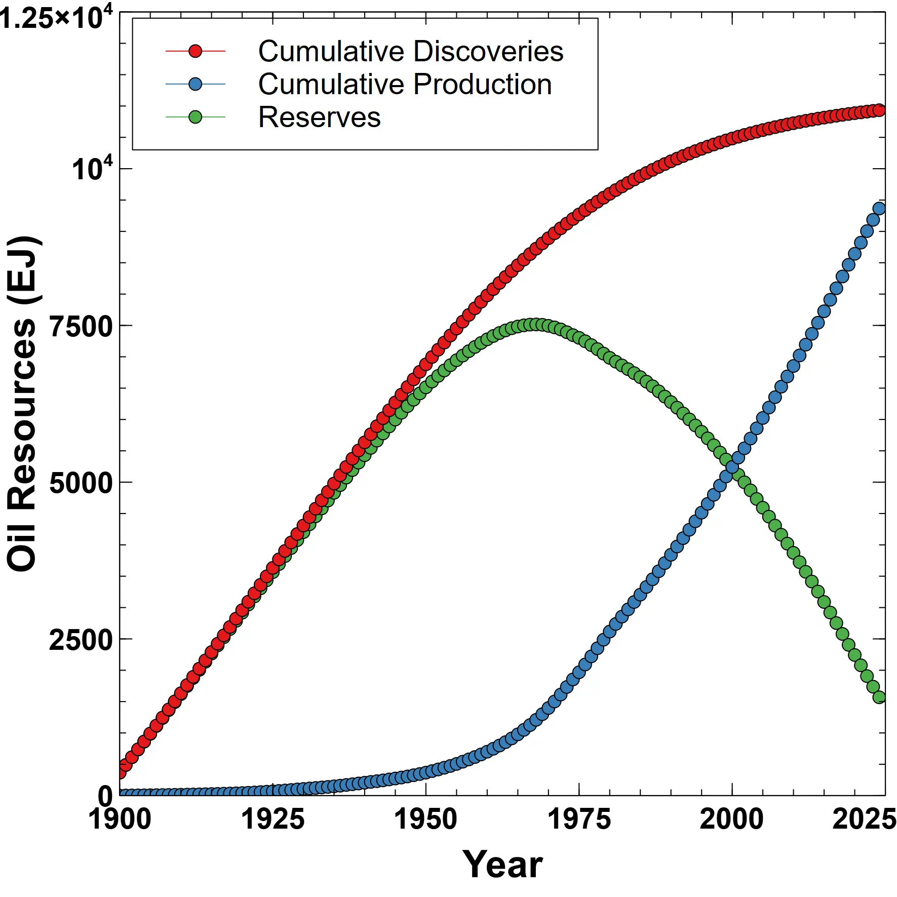 Production data was obtained from the Boston University Institute for Global Sustainability dataset, and remaining reserves are the differences between estimated cumulative annual discoveries and cumulative production. Remaining reserves as of 2020 were taken from the most recent Energy Institute Statistical Review of World Energy - 2025 report, which was used for . The Energy Institute gives world total oil reserves in 2020 as 1732.4 Gbl, which is considerably higher than our top-down estimate of 678 Gb, or the Rystad Energy estimate of 738 Gbl (2P - proven and probable) [14].