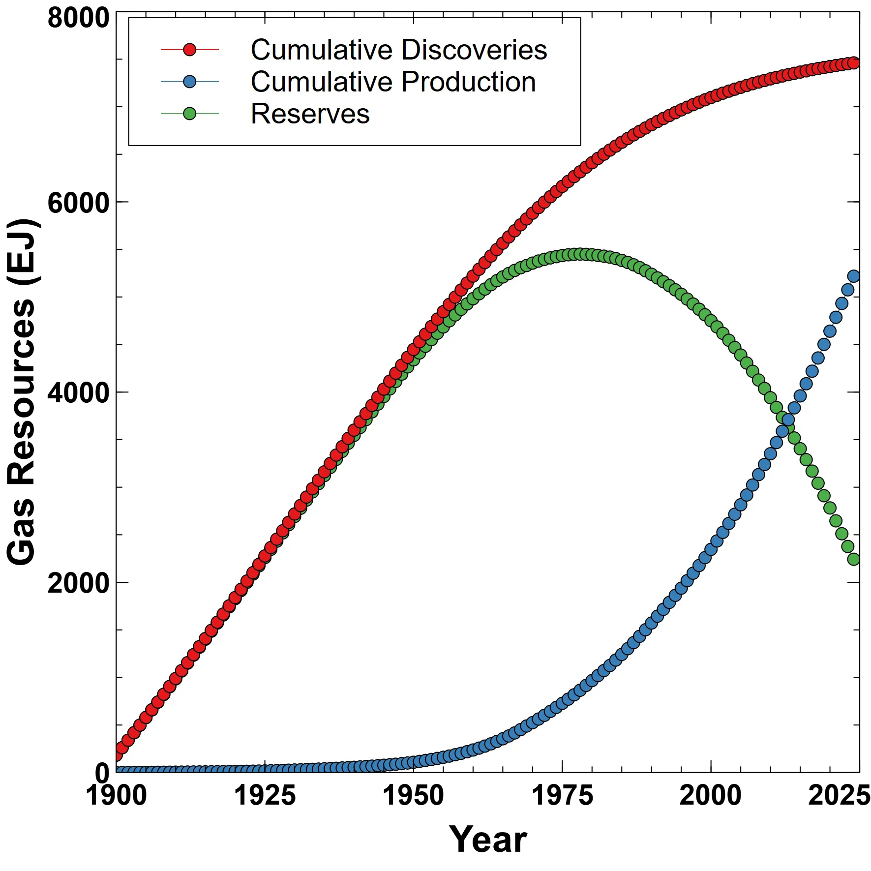Given the sparsity of available data, a model was developed to fit the available data. We assumed that cumulative discoveries less cumulative production in any year represents known reserves. It is widely accepted that global gas discoveries peaked in the 1960s, so our model assumes a logistic distribution of discoveries centered between 1965 and 1970. Given these constraints, the model fits discovery and known reserve data to the production data.