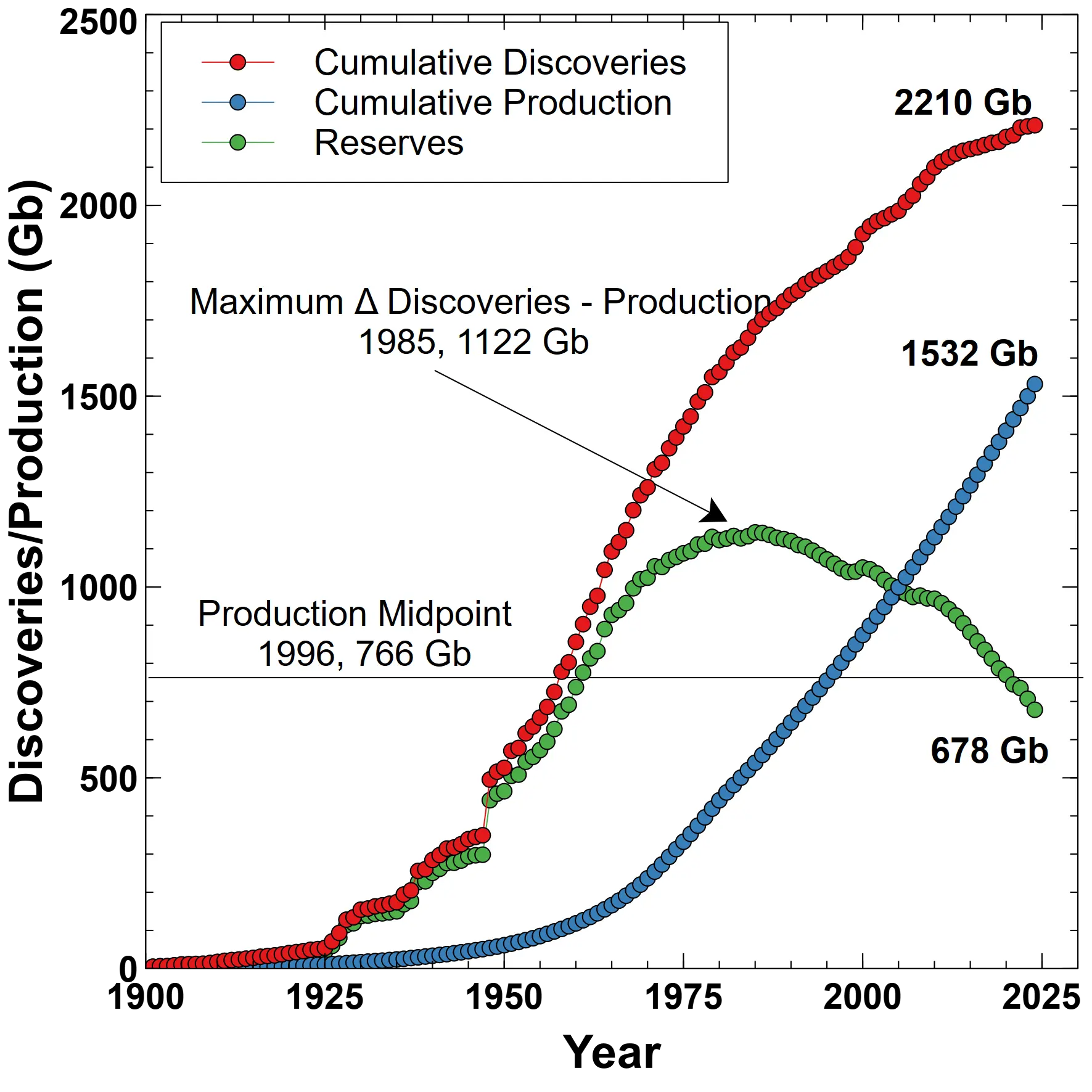 Production data was obtained from the Boston University Institute for Global Sustainability dataset, and remaining reserves are the differences between estimated cumulative annual discoveries and cumulative production. Remaining reserves as of 2020 were taken from the most recent Energy Institute Statistical Review of World Energy - 2025 report, which was used for . The Energy Institute gives world total oil reserves in 2020 as 1732.4 Gbl, which is considerably higher than our top-down estimate of 678 Gb, or the Rystad Energy estimate of 738 Gbl (2P - proven and probable) [14].