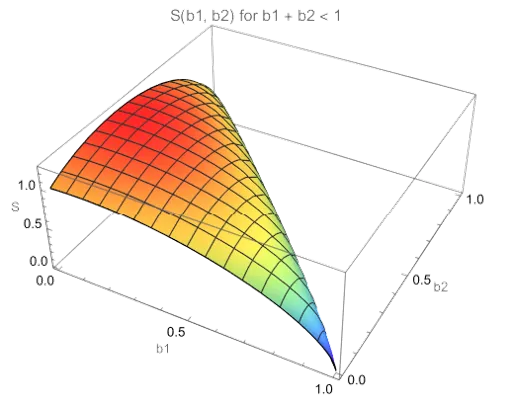 Adding in a third bet would generate a quartic polynomial, and beyond that, Abel showed that polynomials of degree five or higher have no closed form solutions (see The Sum of the Sum of Some Numbers). Still, the maximum value of exists as seen in the surface plot: